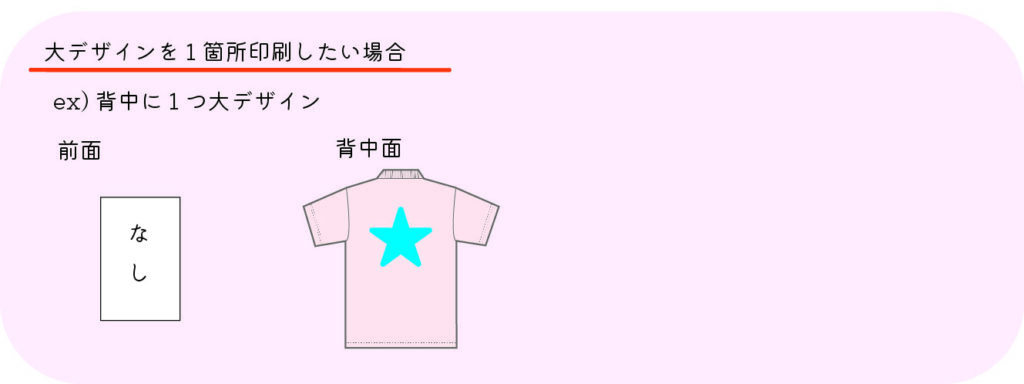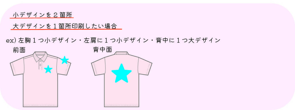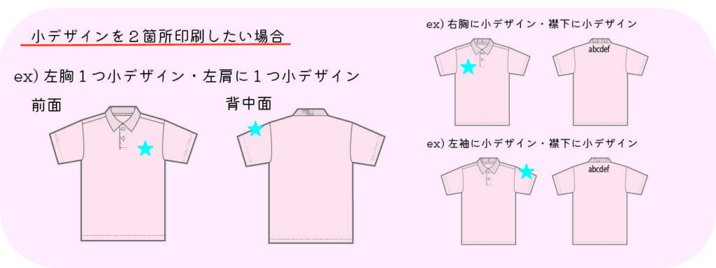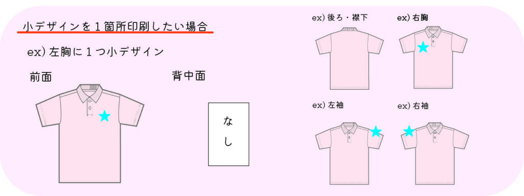 glimmer4.4ozドライポロシャツ-フルカラー 2025.10.06 「印刷の数・大きさ」を選択してください。 デザインの大きさ 10×10cm以内→小デザイン A3サイズ以内→大デザイン です。 デザインの大きさはイメージです。 下記、印刷位置以外の場所への印刷も承っております。お気軽にご相談下さい。 FacebookXHatenaPocketCopy